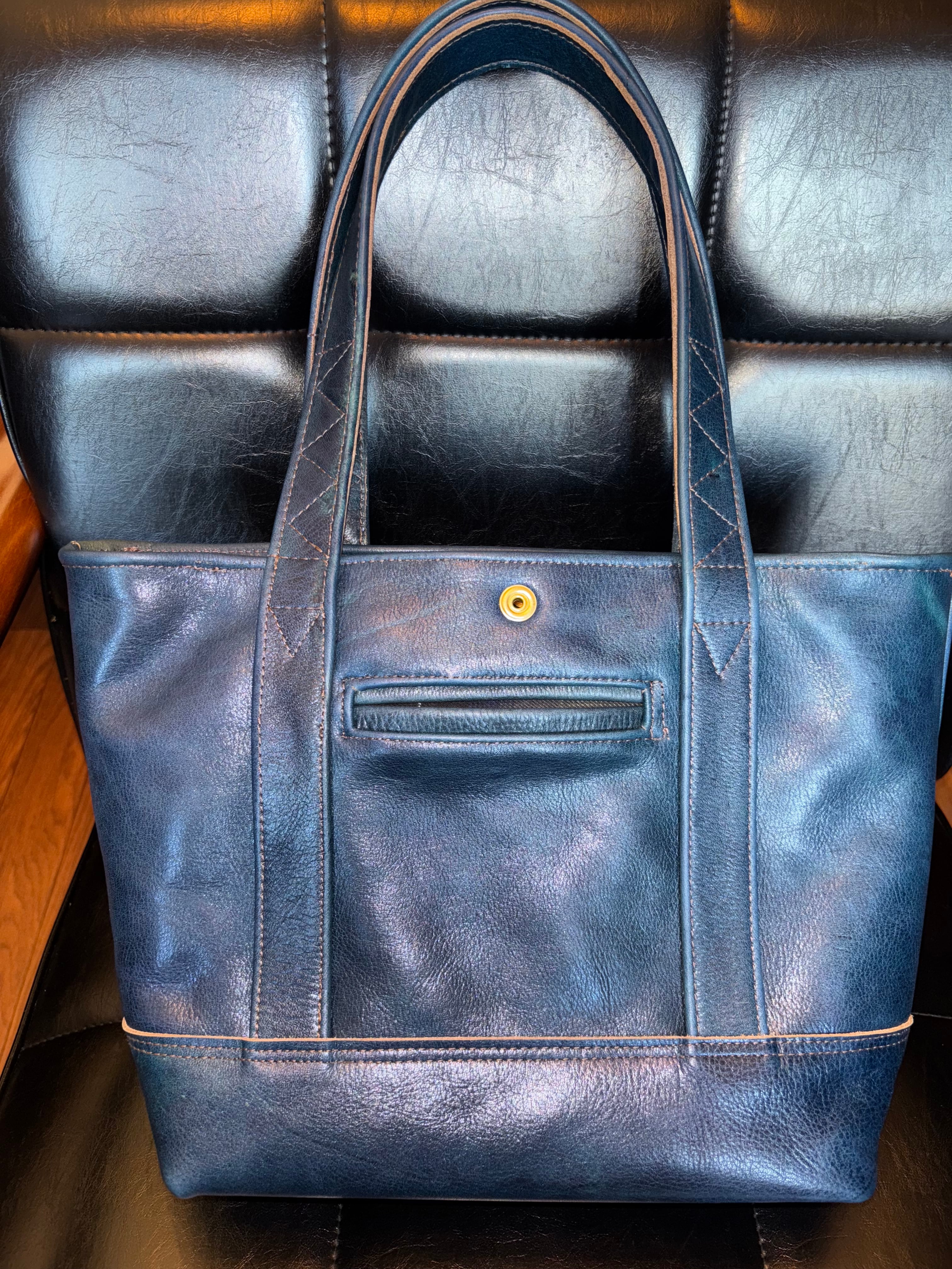 表面・裏面・底面・ハンドル・ポケット、全てタンニン鞣し牛革。色付け、染料。