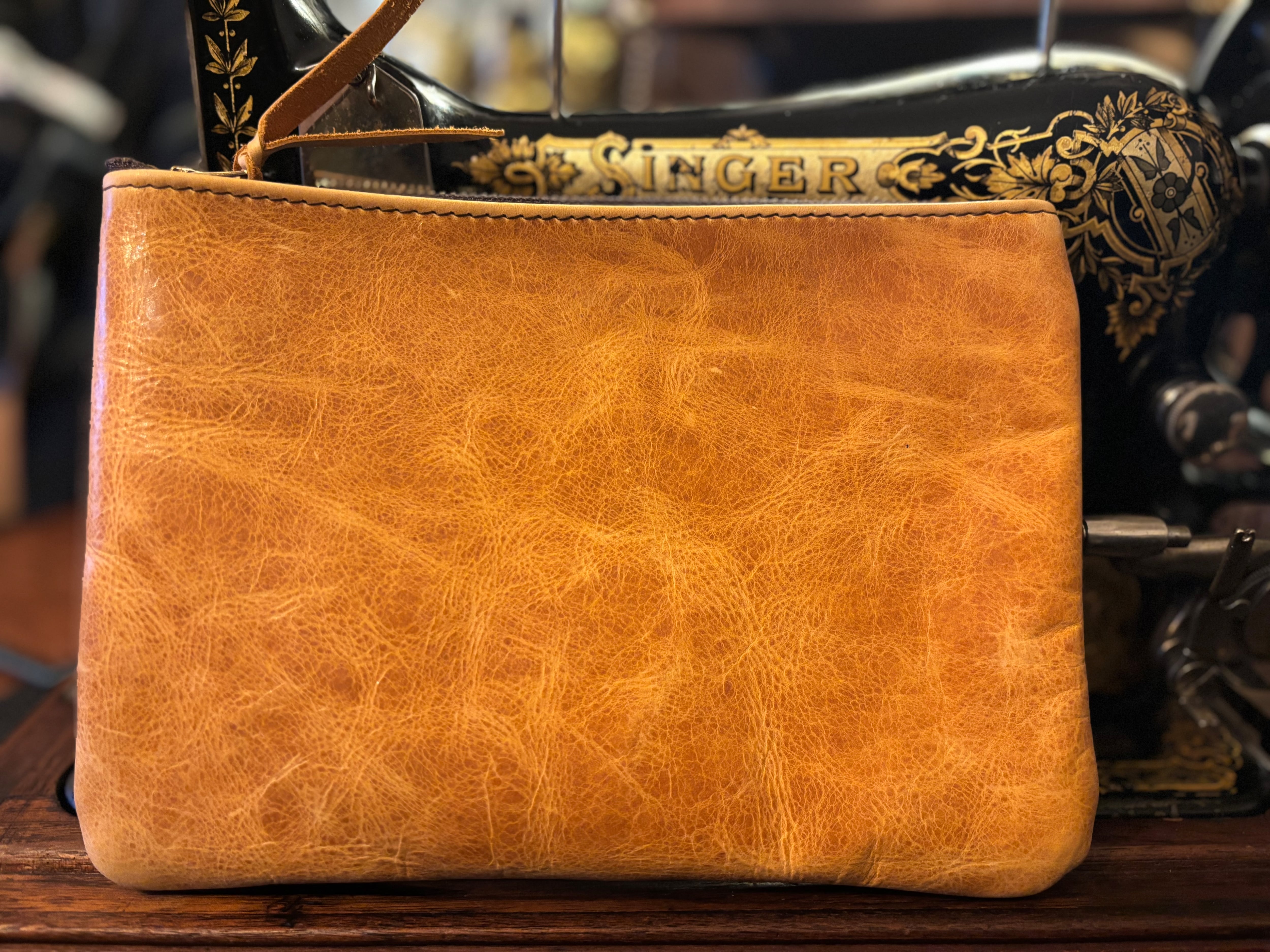 キャメルカラーの牛革プルアップレザーポーチです。クラッキングが入った感じがクールな印象の革でプルアップ特有の揉み込んだり折り曲げたりした時のオイル移りが何とも綺麗で手と目に馴染みます。