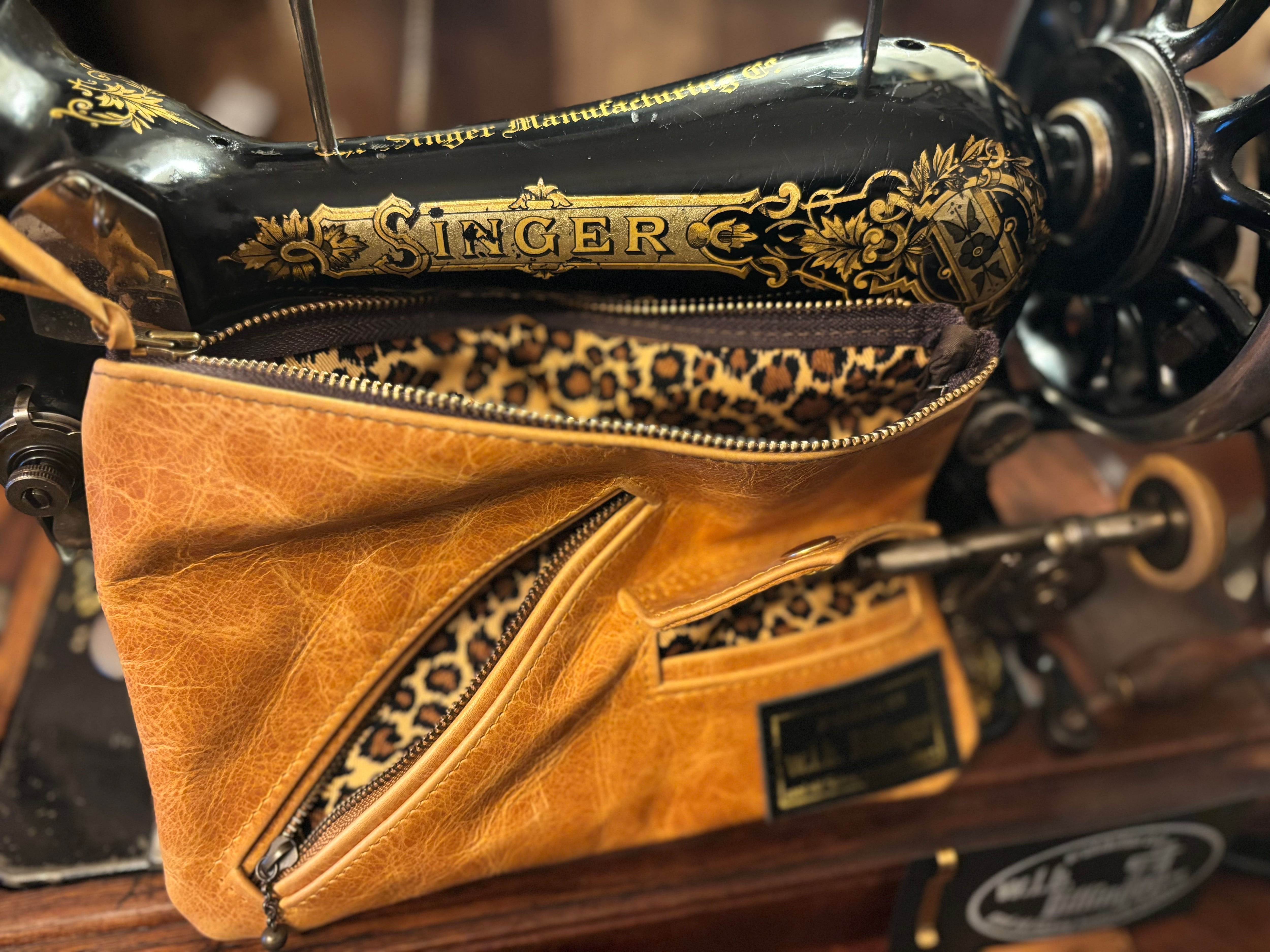 正面zip付両玉縁スラッシュポケット開口14cm、深さ6cm。フラップポケット開口8cm、深さ5cm。裏地豹柄生地、パイピング処理。真鍮製ジャンパーホックメス。