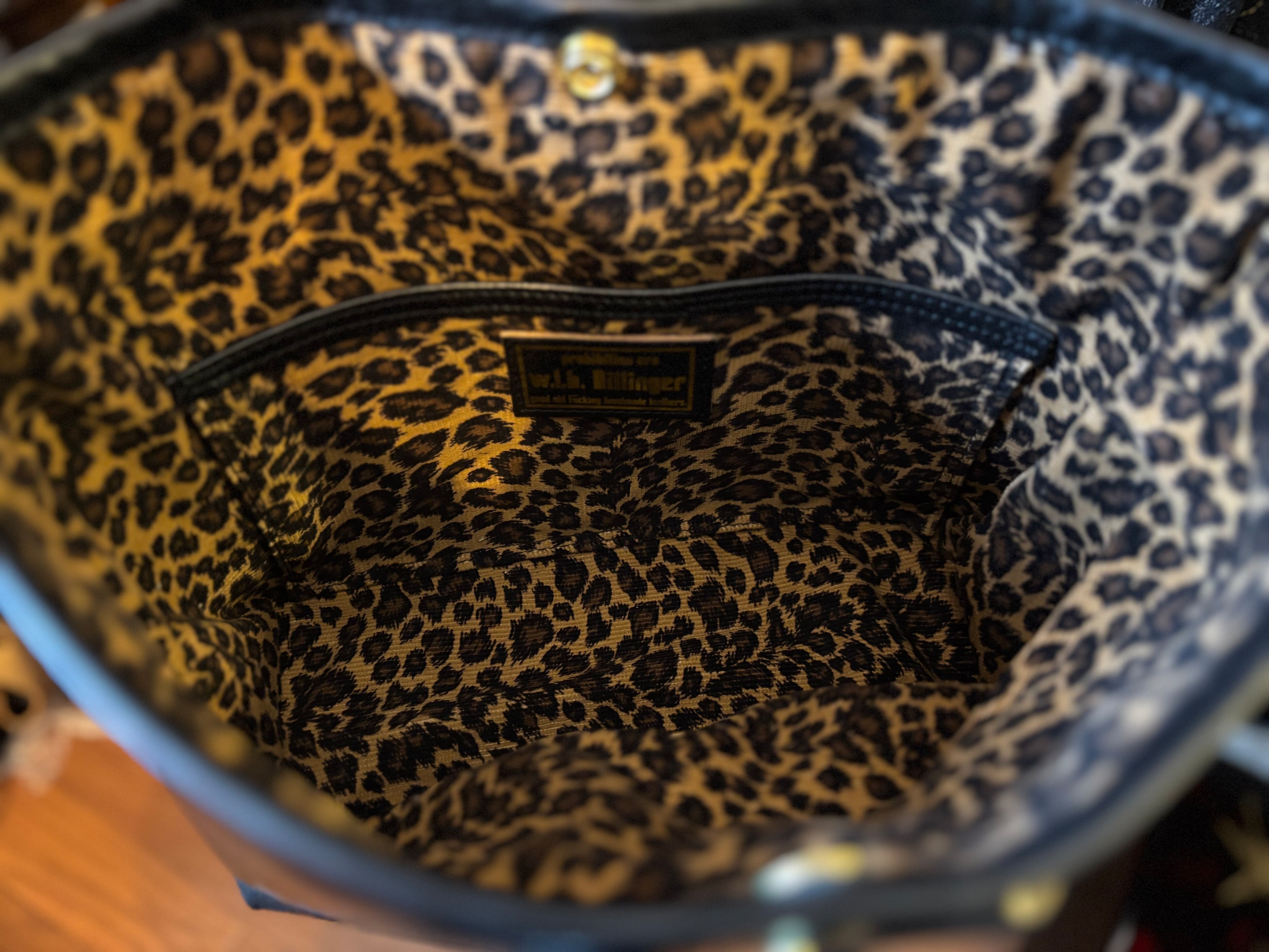 内装、コーデュロイ豹柄生地。内ポケット開口23cm深さ12cm。ベルト片側真鍮ダブルボタン式、片側真鍮バックル付(アジャスト調整穴4ヶ有)底面芯材入一部バラ傷裏面側補強有。