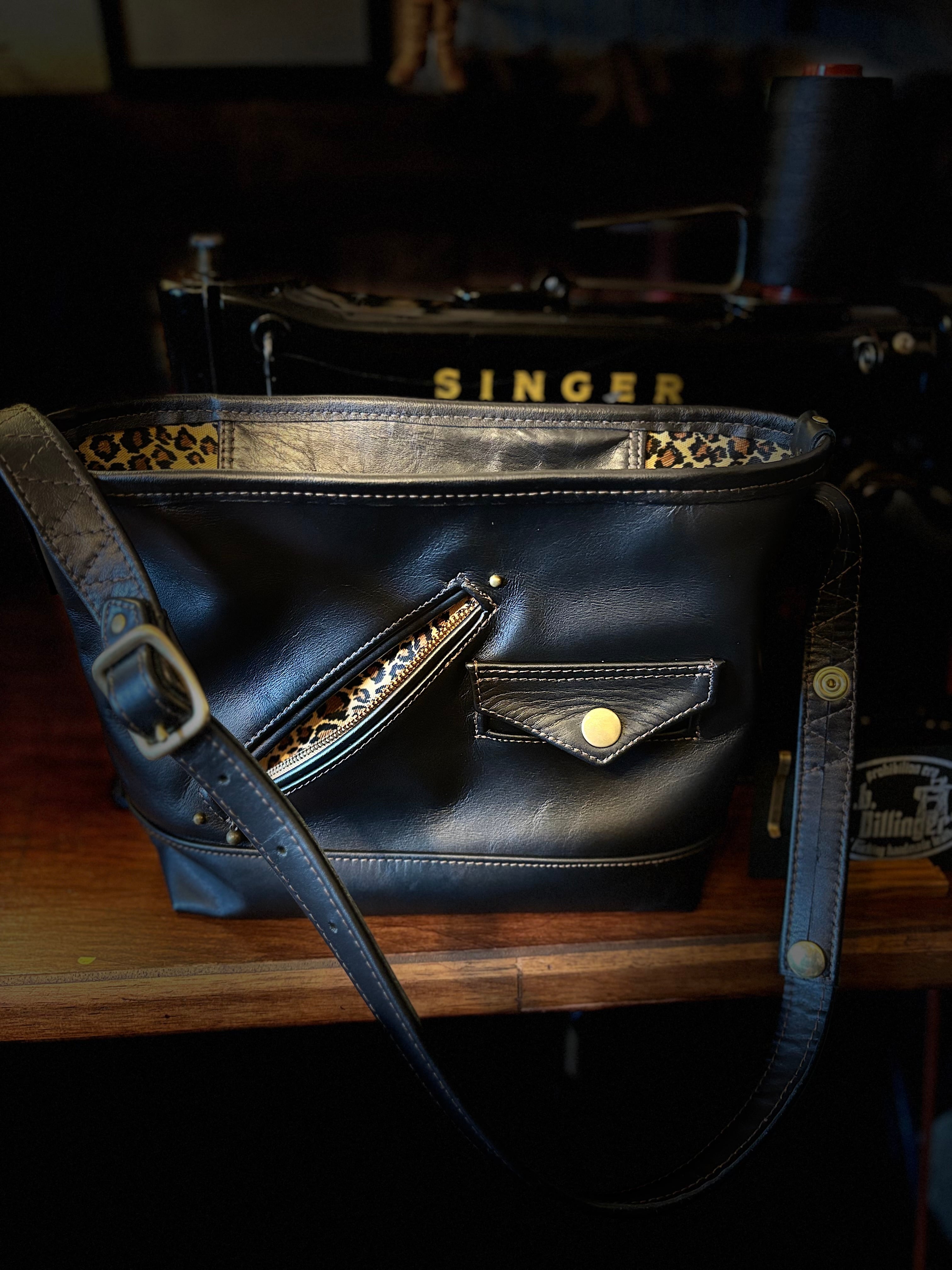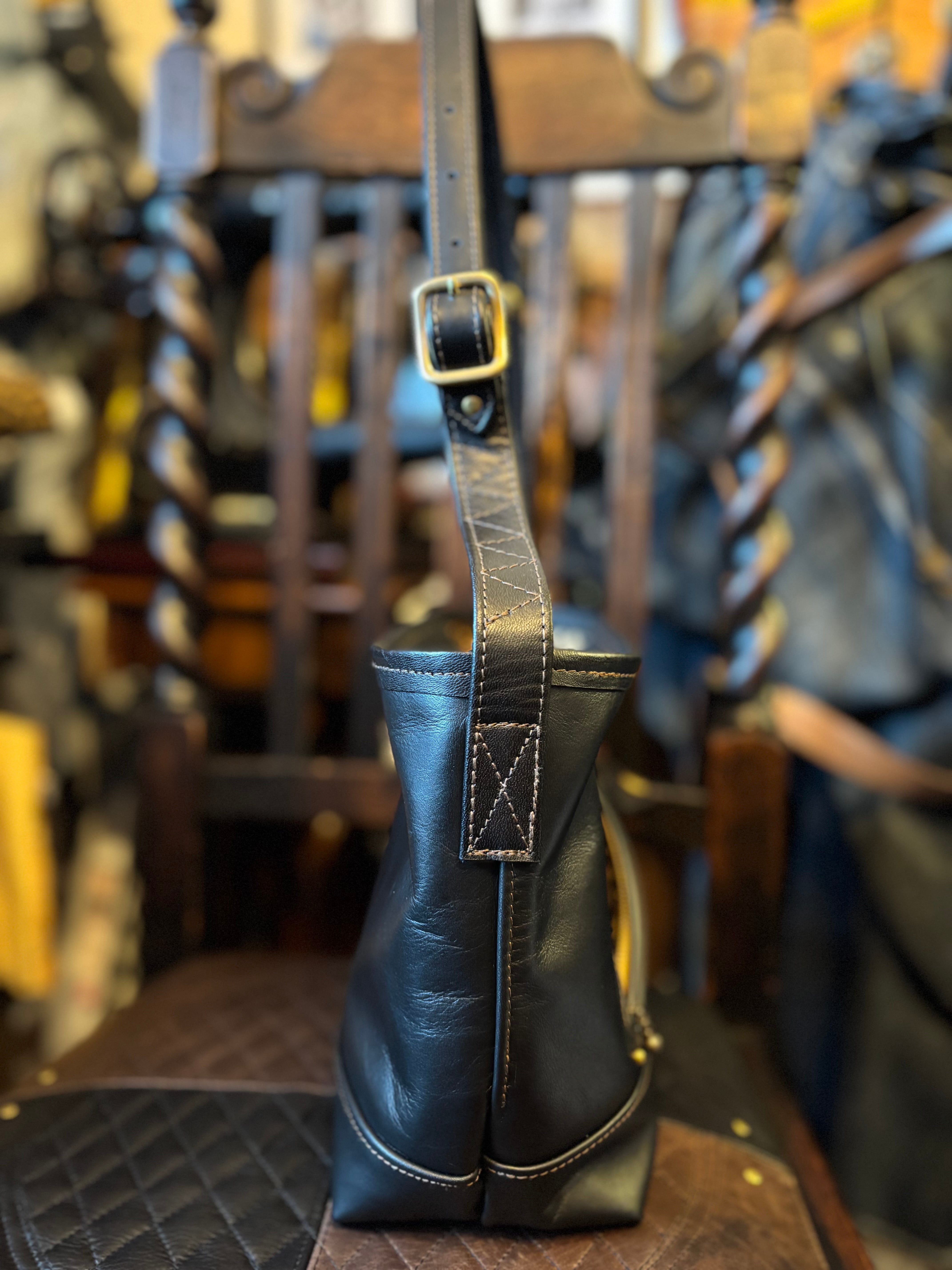 ブラックの姫路レザーに映える様ブラウンのステッチをかけてクラシカルな雰囲気に仕上げました。始めはしっとりマットな感じのブラックレザーですが使い込む毎にオイルがあがって綺麗な艶が生まれます。