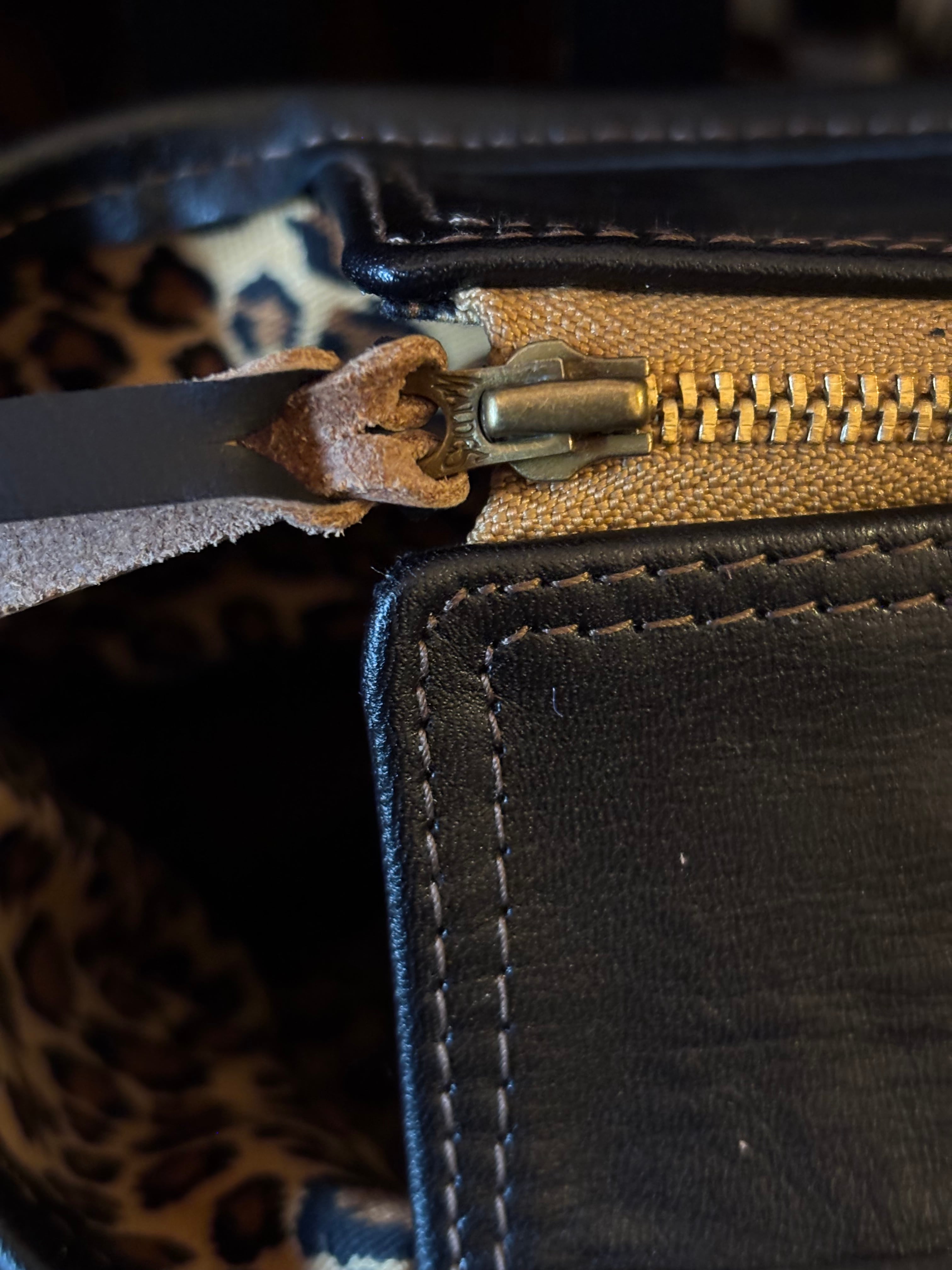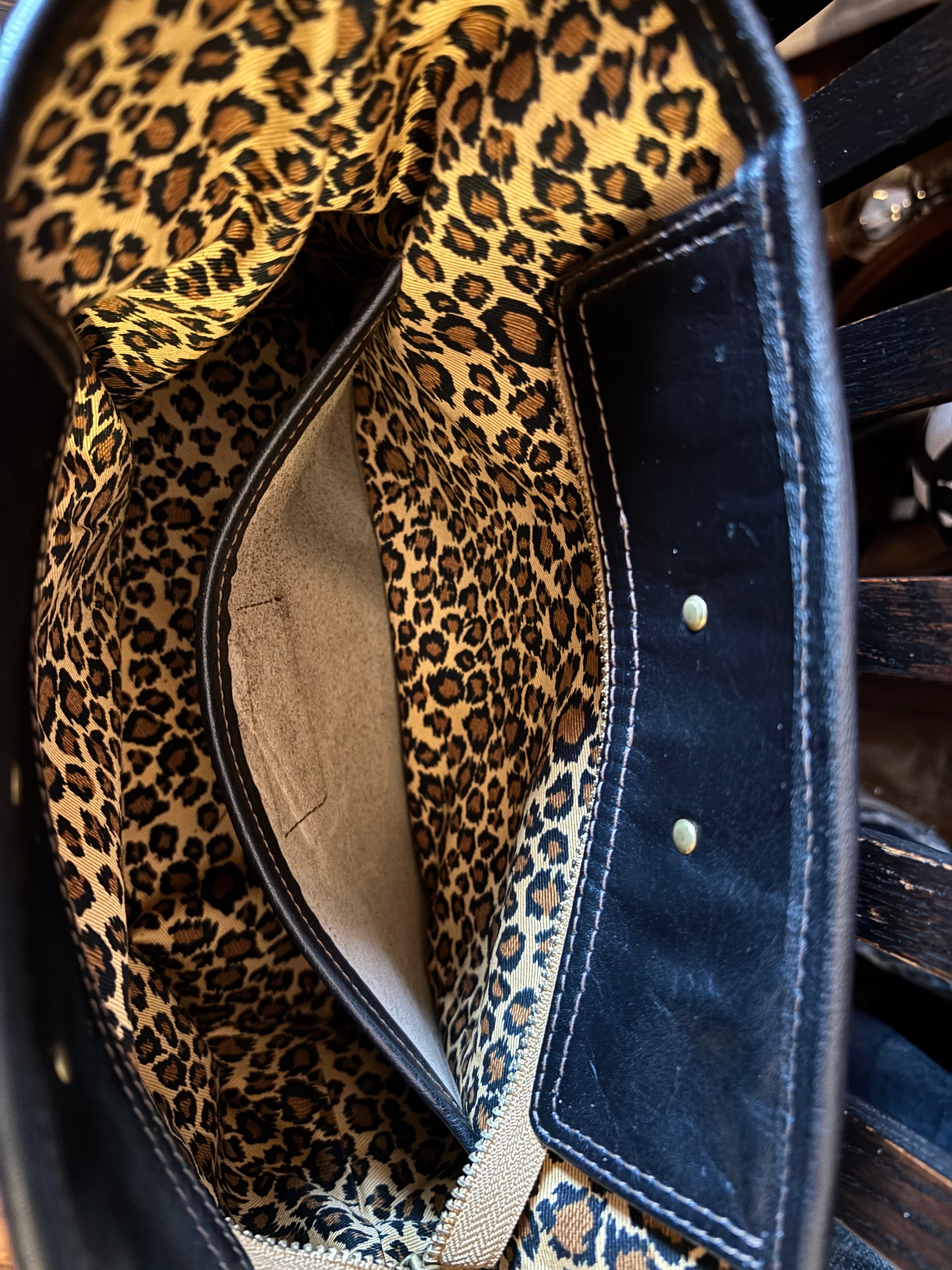内装、豹柄生地。内ポケットに希少なヌバックのカンガルーレザーを使用。銀面を擦っていますのでキメ細かくしっとりベルベットの様な手触りです。開口23cm深さ12cm。