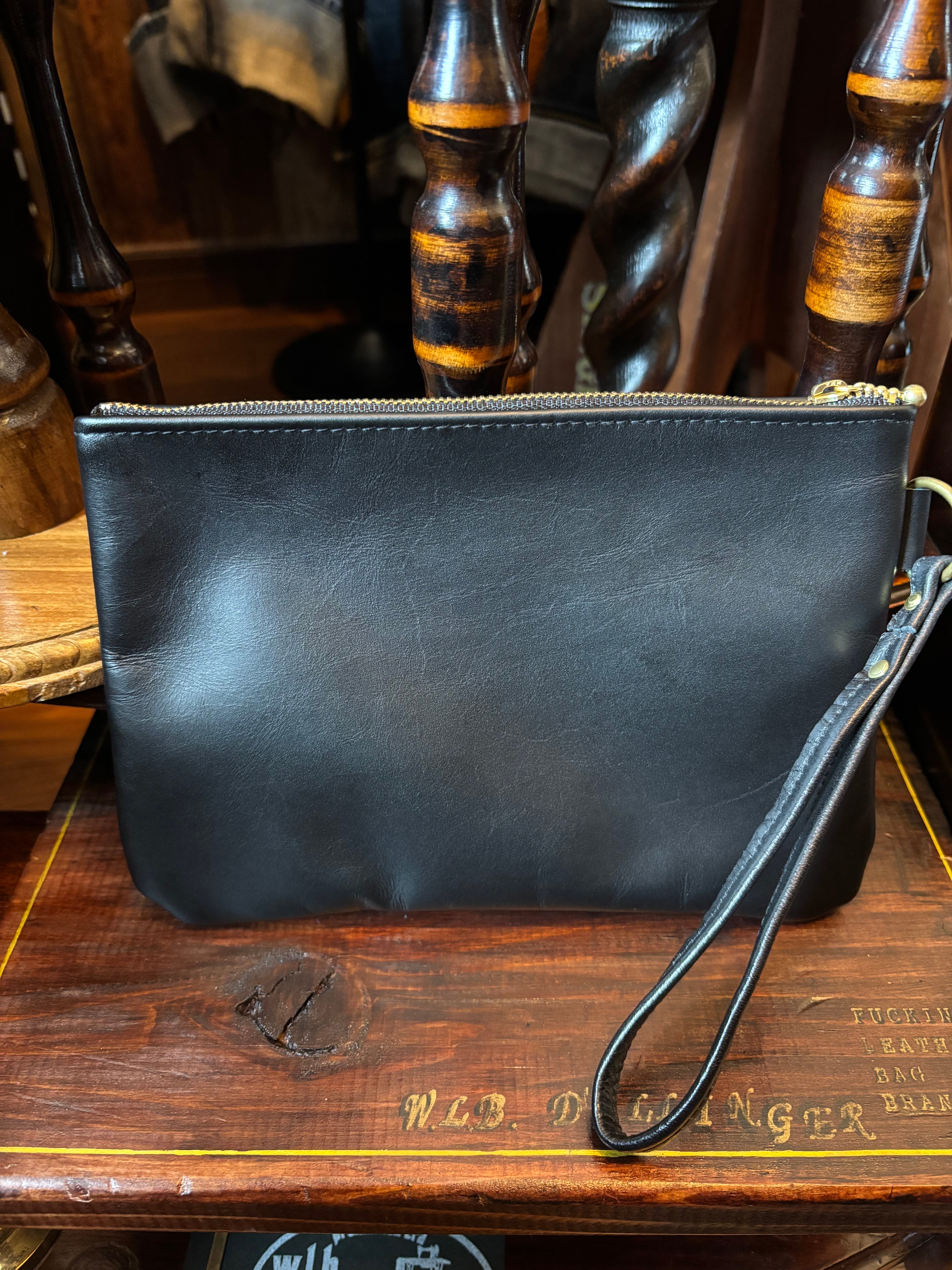 メインにコンビ鞣し黒染料のカウレザーを使用。ストラップ部にクロム鞣し黒顔料のゴートレザーを使用。Dカン&ハンドストラップを付けておりますのでちょっとしたお出かけ時に軽く手首に掛けて持ち歩けます。